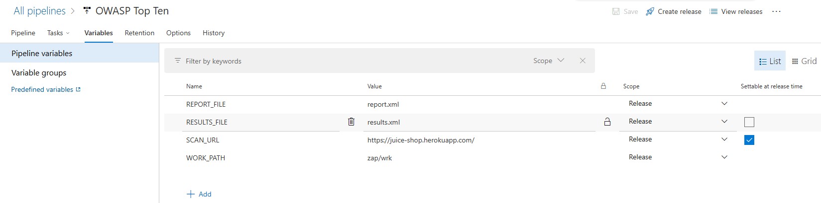 SCAN_URL: This is the website URL that will be scanned by the ZAP scanner.REPORT_FILE: This is the file name of the report that will be generated by the ZAP scanner.RESULTS_FILE: This is the NUnit formatted file that will be generated by the transformation task.WORK_PATH: This is the folder in which theREPORT_FILEand theRESULTS_FILEwill be created.